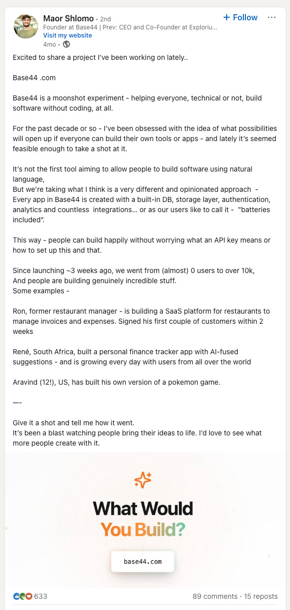 Its perfect timing wasn’t the only reason for Base44’s massive success: it required relentless execution from Shlomo, who – on that same podcast – mentioned not sleeping more than a few hours in a row for months. Moreover, building in public – through constantly sharing his progress on LinkedIn – turned out to be a brilliant marketing strategy: the posts would regularly go viral, creating buzz and awareness for Base44 at virtually no cost. Shlomo gained a lot of traction especially within the Israeli tech community, many of whom became fans rooting for his success, and offered help and support along the way.