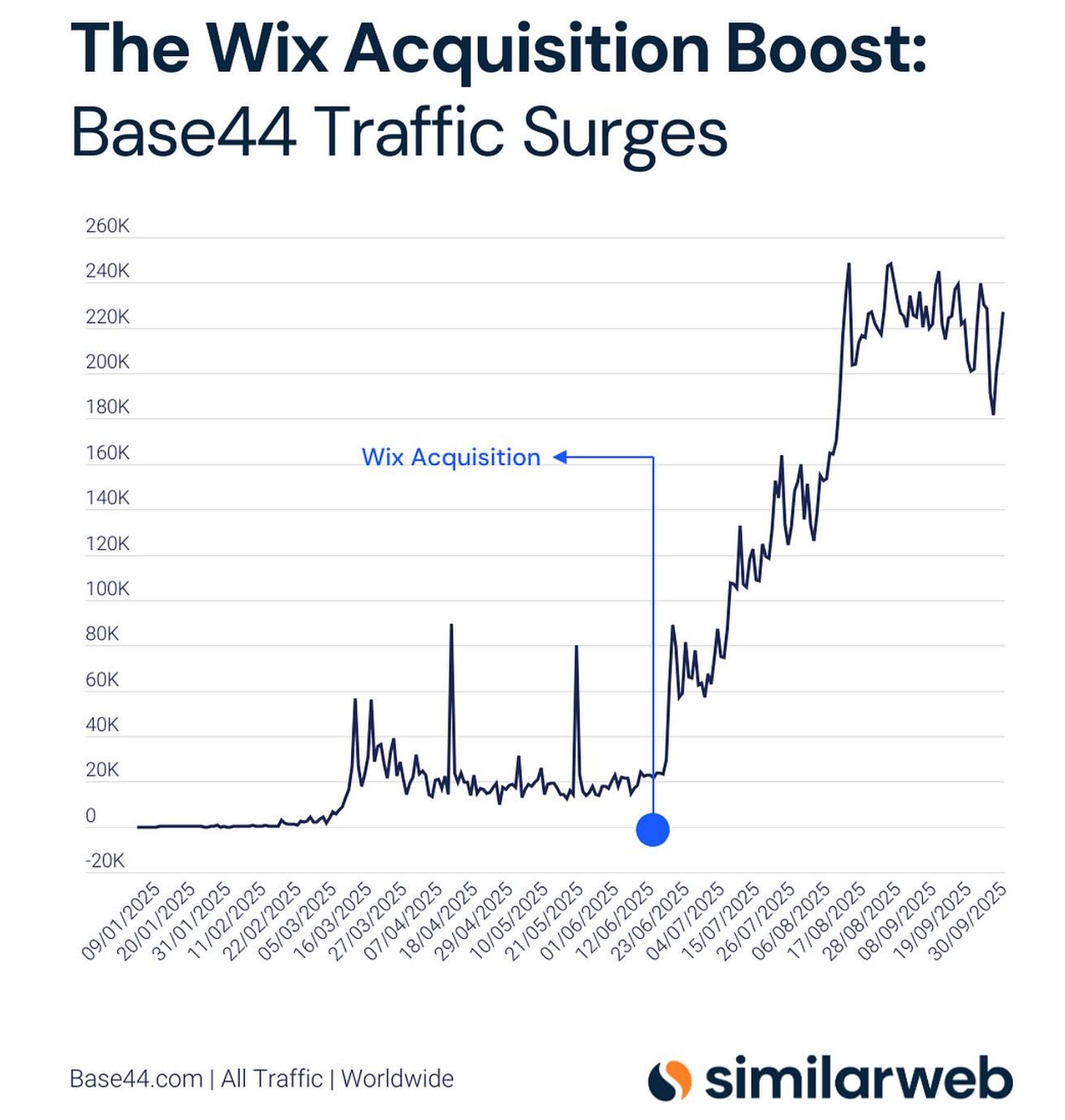 The decision to sell, Shlomo explained on the Startup for Startup podcast last July, was partly driven by the fact that his viral building-in-public posts – which had fueled Base44’s growth – were hitting a ceiling; since he couldn’t figure out how to use paid marketing effectively, the VC route didn’t seem to make sense. Wix, however, has been mastering direct online marketing for almost 2 decades2. Aiming the full force of Wix’s powerful marketing machine at Base44 unleashed a hockey-stick growth: