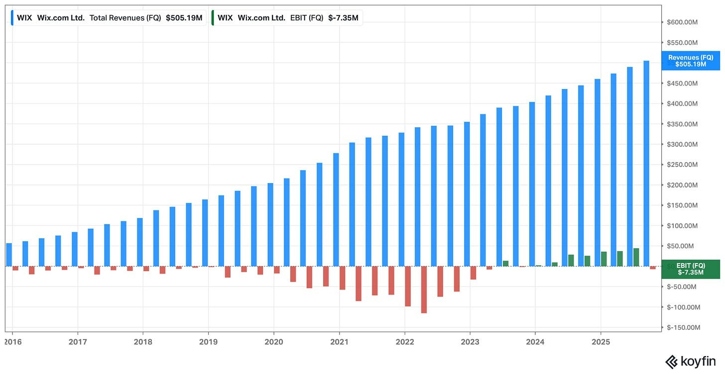 To sum up: the couple of extra revenue percentage points provided by Base44 comes at a steep cost: depressed gross margins, increased R&D costs, and a ballooning marketing spend. For the first time since 2023 – when it recovered from its Covid hangover – Wix moved into a negative EBIT territory. And the trend is only expected to accelerate: the team is incentivized to push as hard as they can on Base44 growth, and collect additional earn-out payments as they are driving down Wix’s margins.