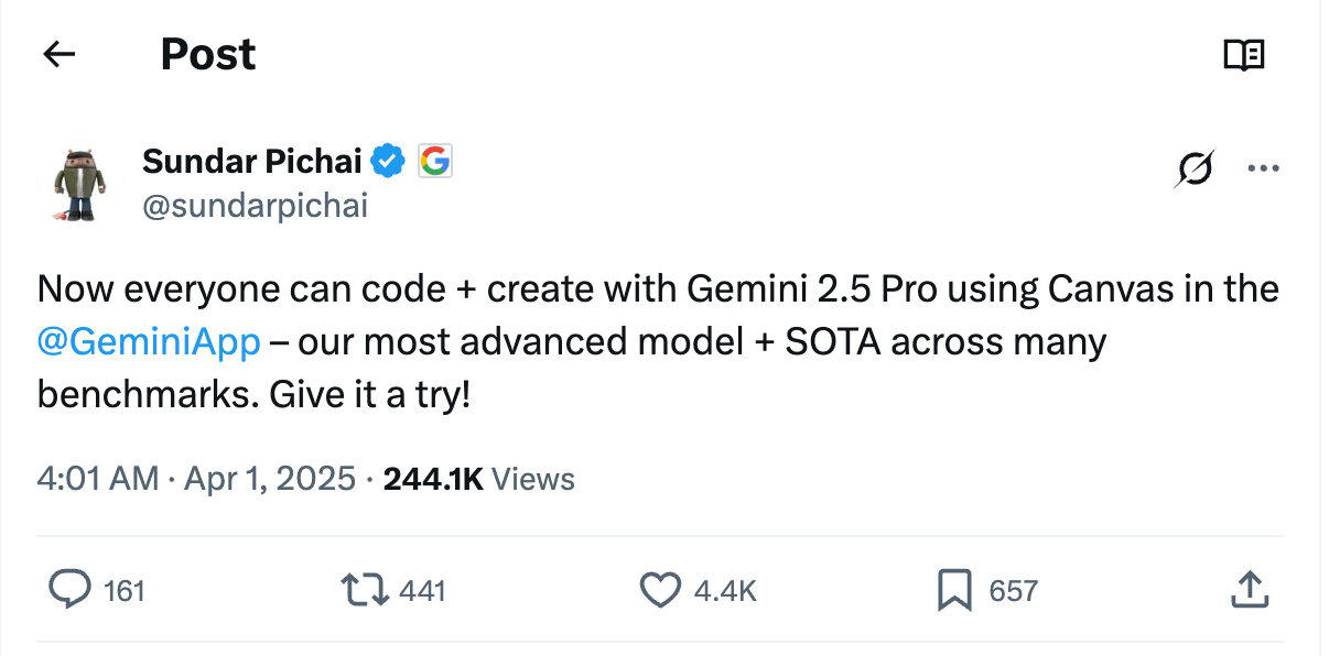 Gemini 2.5 shot right to the top of the benchmark tables (for now at least). And it’s widely available for free! But while a similar strategy worked in Google’s favor 25 years ago, time will tell if Google gets lucky in this case too, or if we’ll just see competitive models soon being launched (and priced competitively) by other AI companies. While it may take time for the dust to settle on whether betting on an integrated infrastructure again leads to superior technology and a durable advantage, it is Google’s best hope; so it might as well, as Sundar put it: Give it a try!