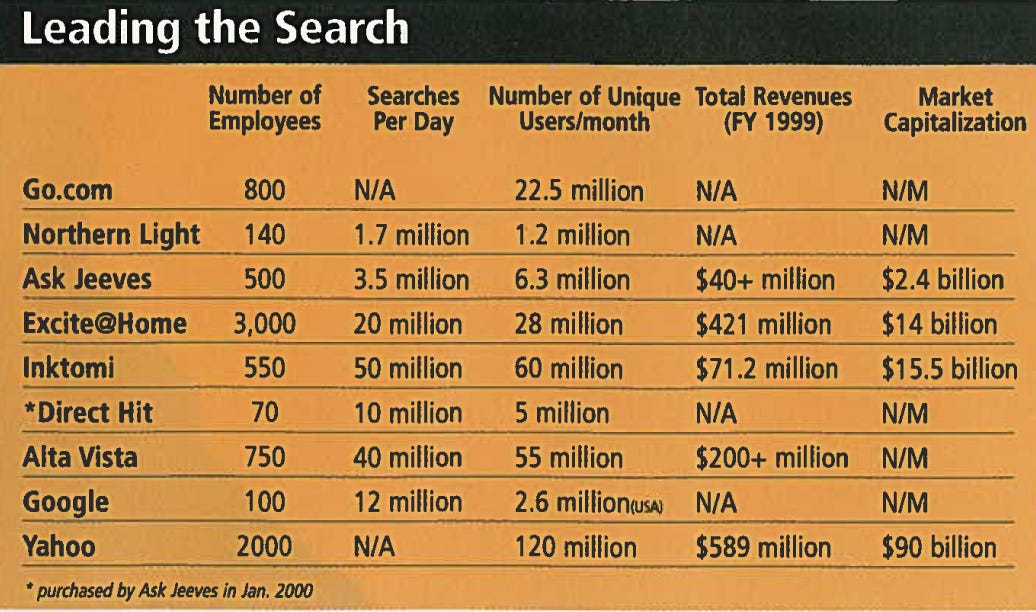 Other portals wanted a piece of Yahoo's traffic: Excite, Lycos, and Disney's Go.com. And other search companies, like AlltheWeb, Teoma, and HotBot, fought alongside Google for the crumbs falling from Inktomi's table. While Wall Street focused on the portal wars, the struggle for search domination wasn't of much interest to anyone but a handful of analysts. There was no money in it.
