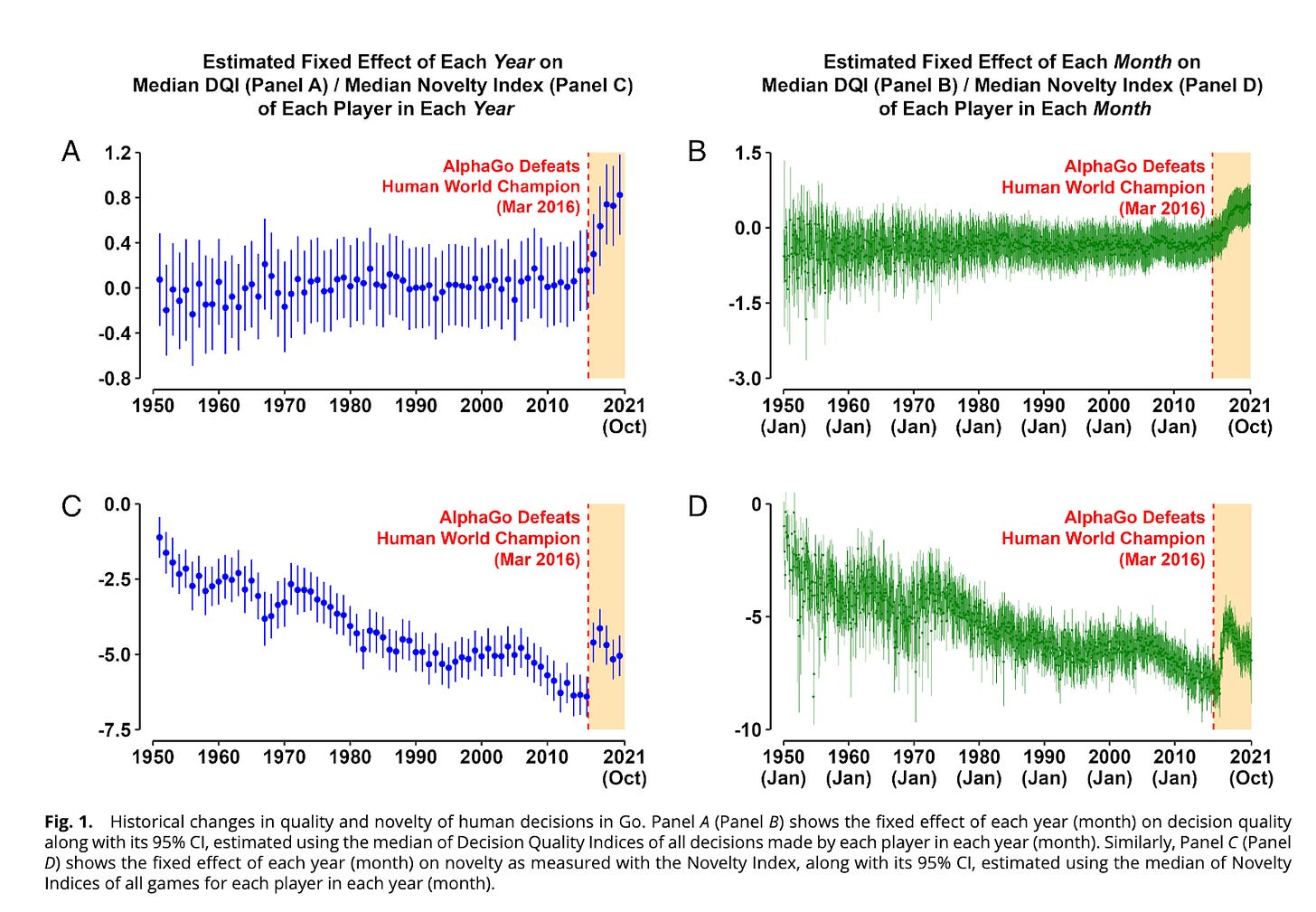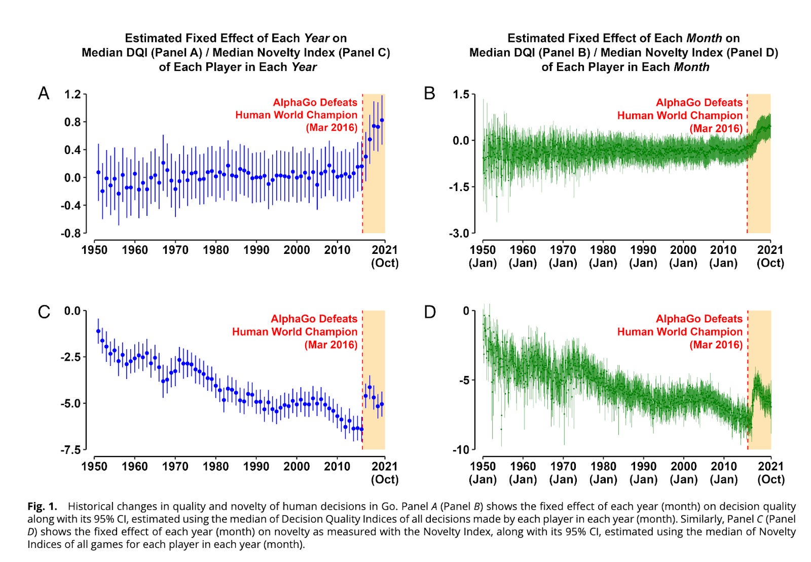 This is already happening at Go. Beyond Lee’s “divine move”, researchers have found that since AlphaGo’s victory in 2016, there has been a surge in the quality and novelty of human decisions in the game of Go. After years of decreasing novelty.